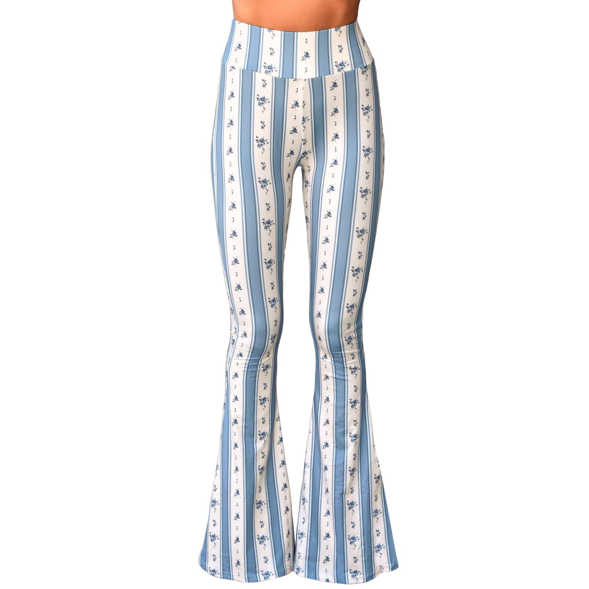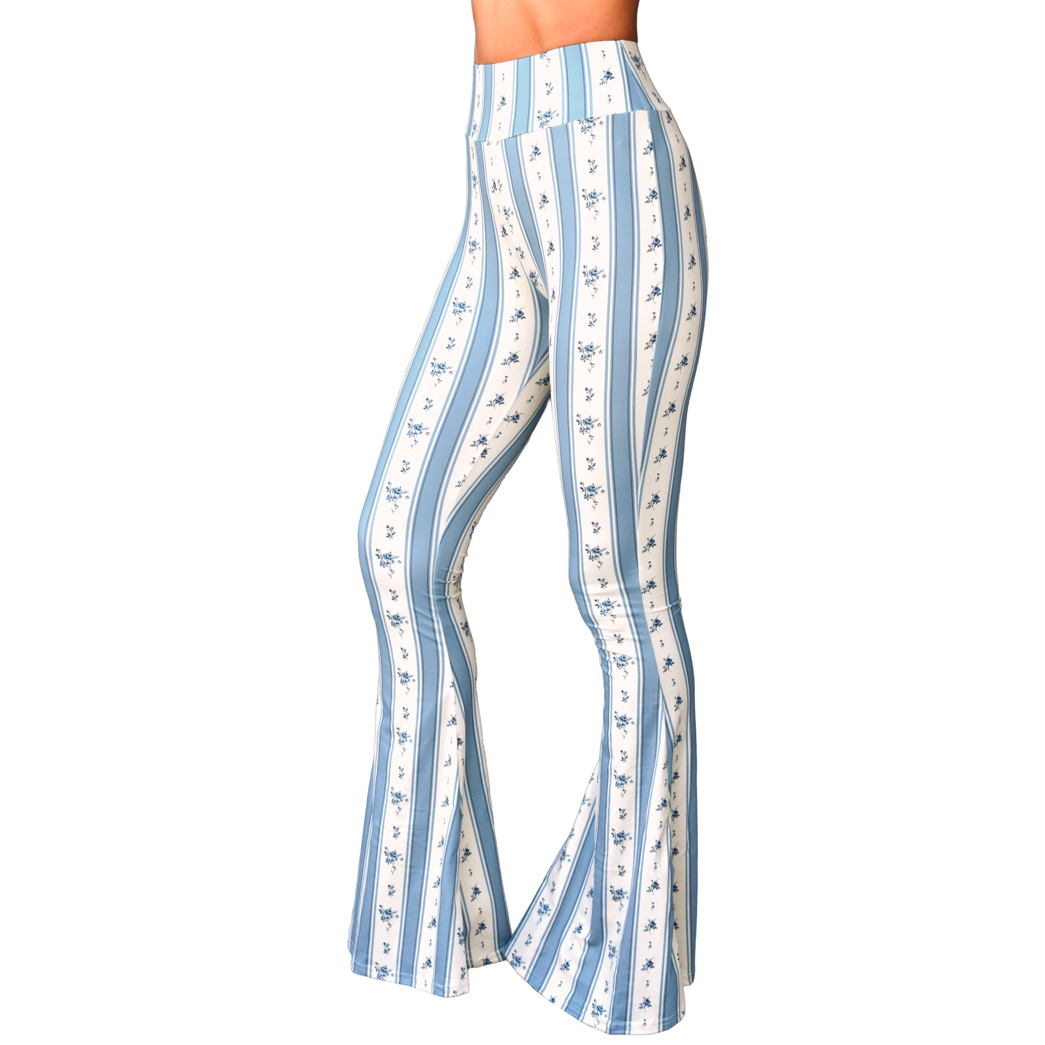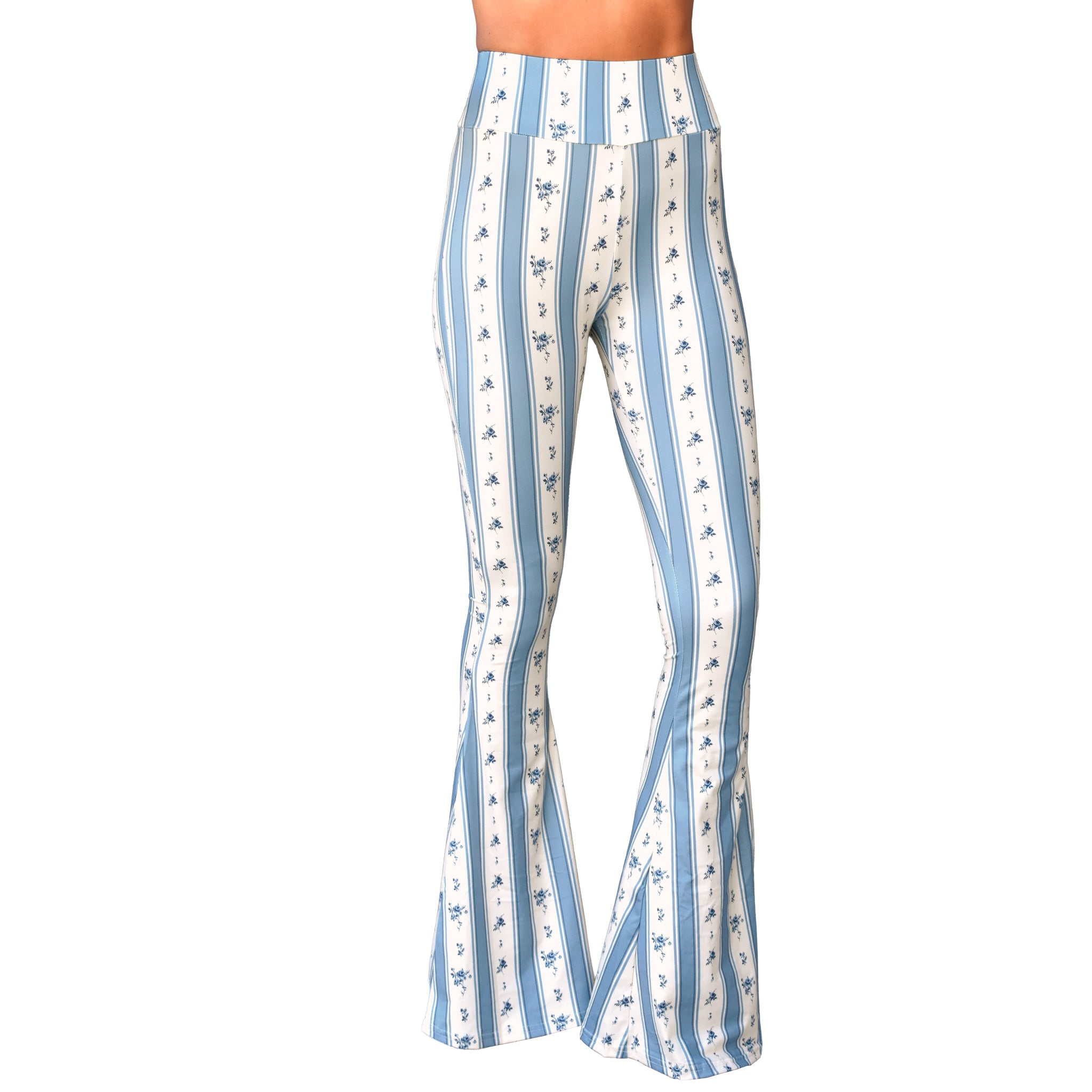 These bell bottom pants feature our exclusive blue coquette floral stripe print.