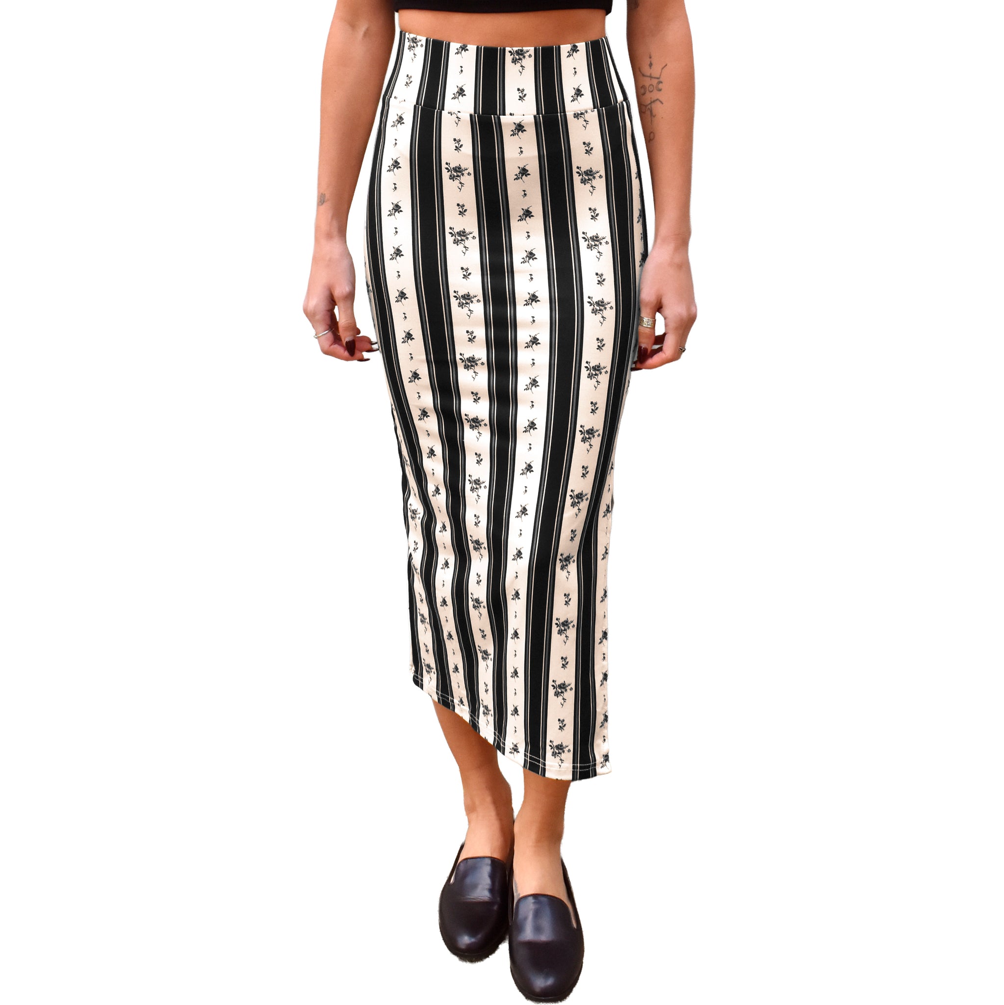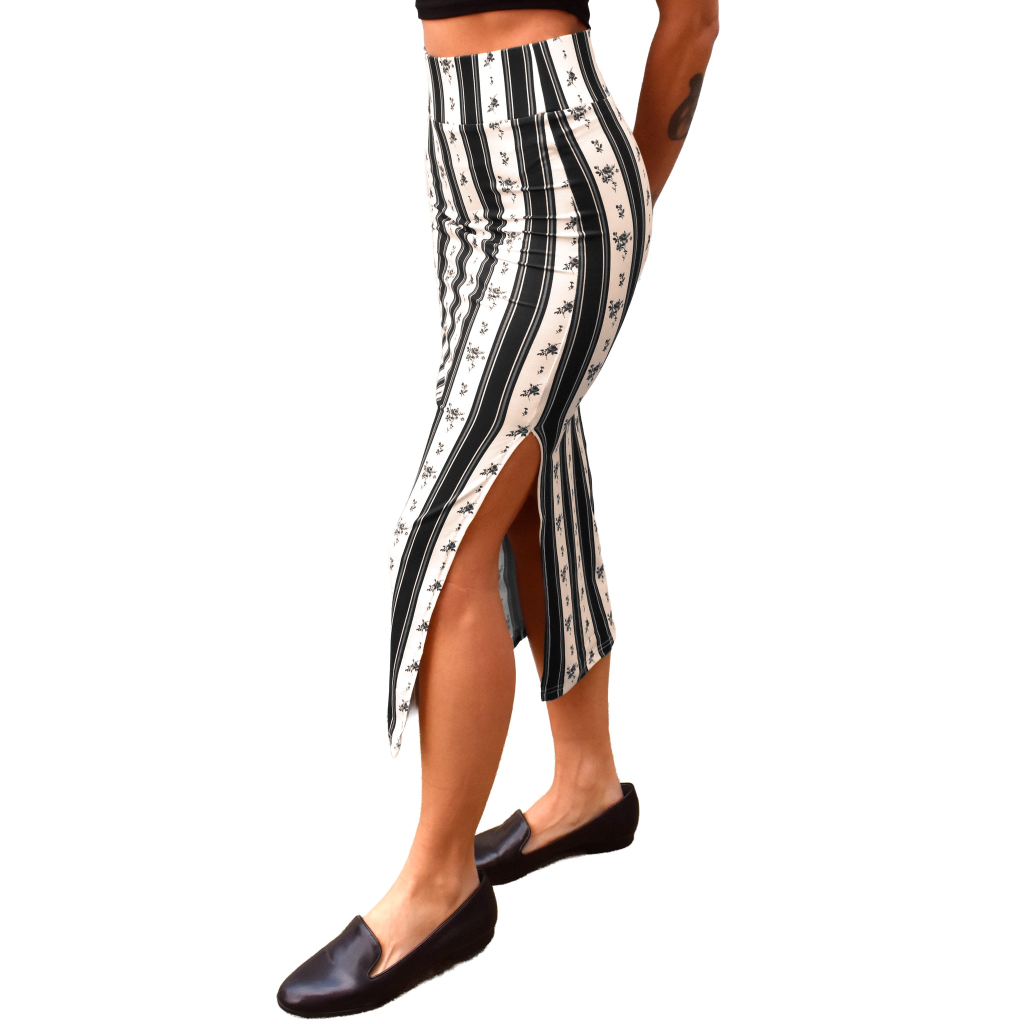 This stylish midi skirt is the perfect mix of comfort and fashion. With a tight bodycon fit and a slit on one side, it creates a sexy silhouette that is flattering on all body types. The wide elastic waistband provides a tummy-control flattening effect and can be folded over, allowing the wearer to choose a high- or mid-rise waist. The skirt is made in high quality, ultra soft, four-way stretch knit material, making it super comfortable and a great option for all seasons. Pair it with a fancy blouse and heels for a formal occasion, or dress it down with a crop top and tennis shoes for a more casual look. Available in a variety of prints and solid colors including leopard, cowhide, coquette florals, solid black and heather grey. Love a set? Browse our collection for matching tops.