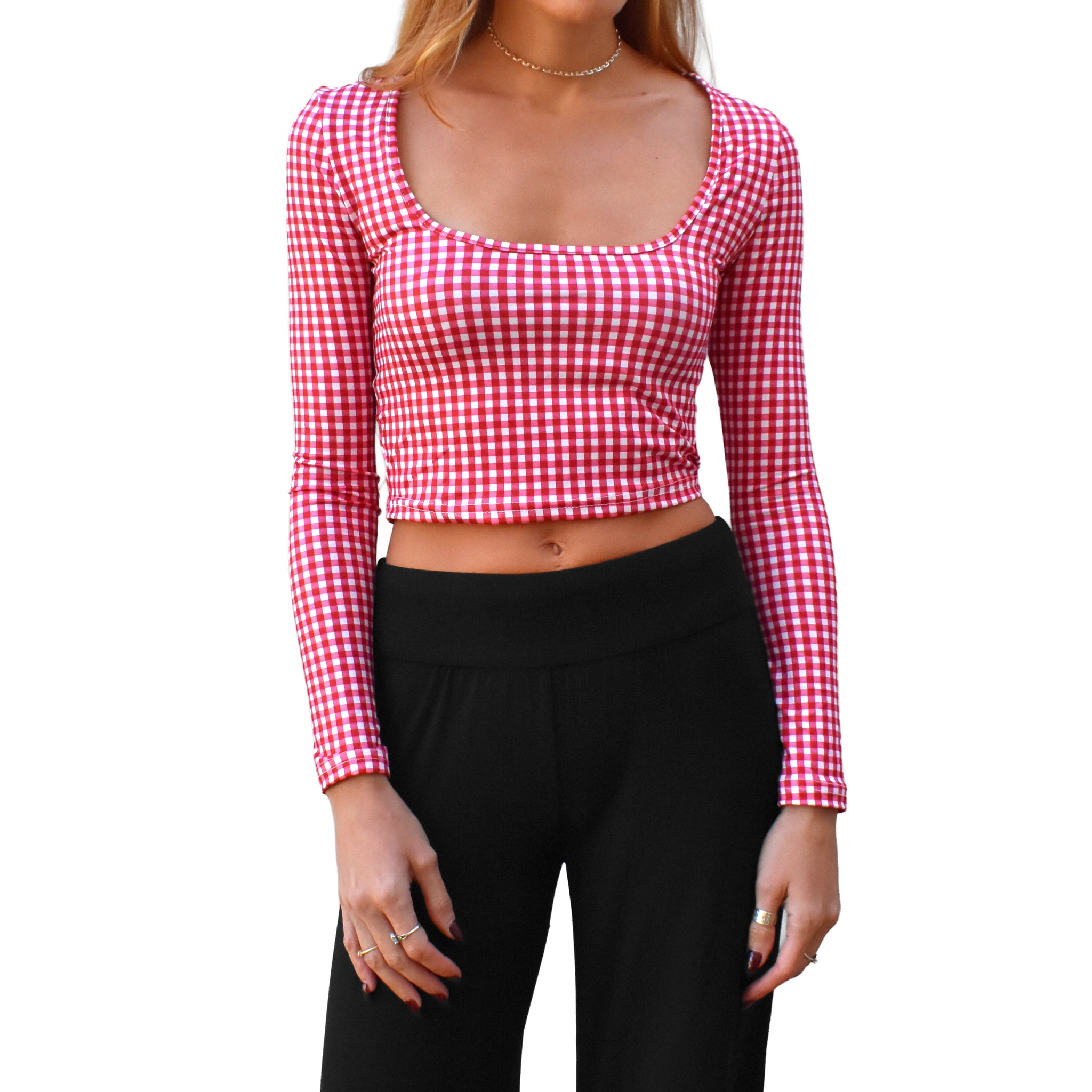 This cute top features a deep low cut square neckline, long sleeves, cropped short length and a tight fit for a sleek and flattering silhouette. It is made in high quality, ultra soft, four-way stretch knit material, making it super comfortable and a great option for all seasons. Available in a variety of prints and solid colors including leopard, cowhide, coquette florals, gingham, heather grey and solid black. Love a set? Browse our collection for matching bottoms.