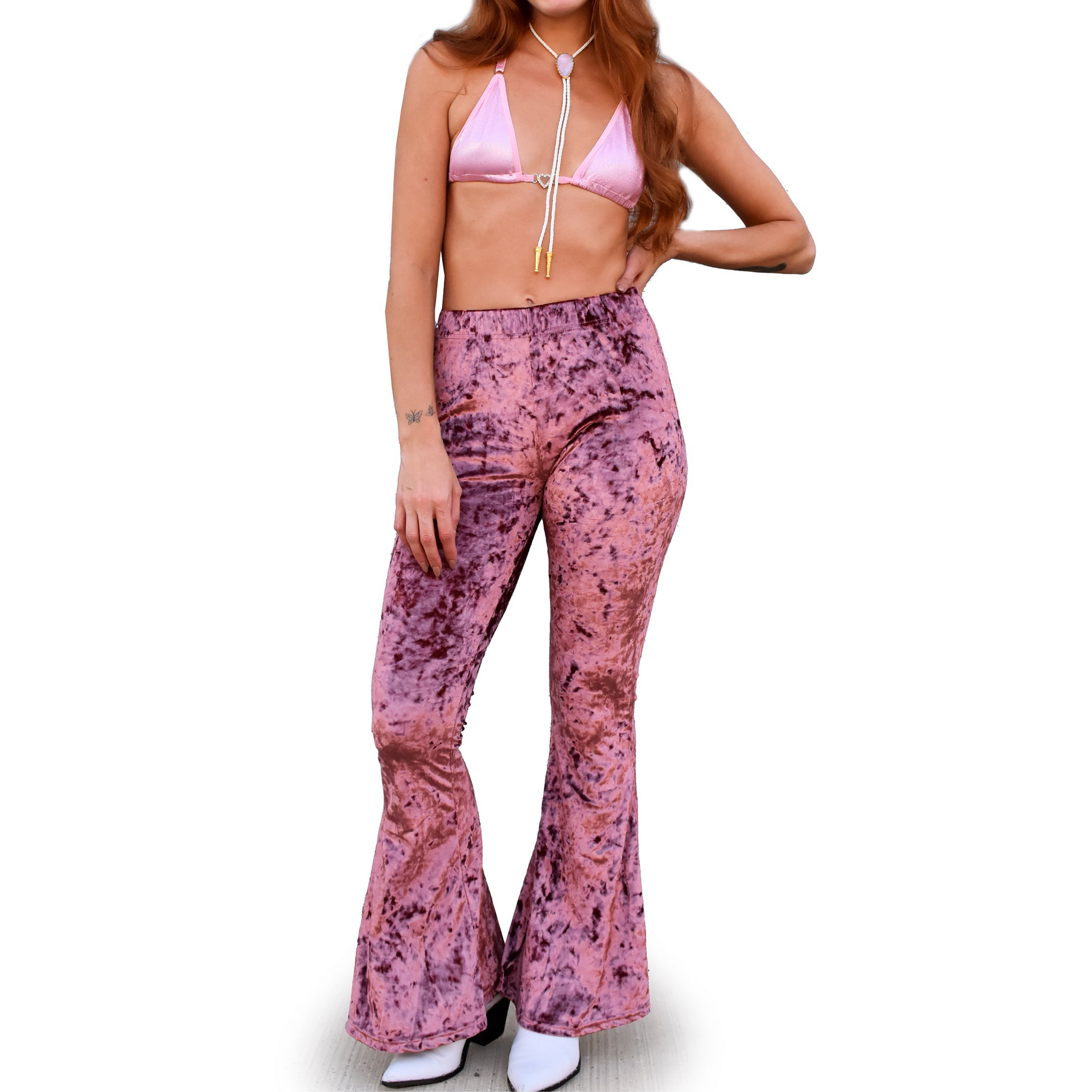 Gorgeous fitted bell bottom pants in lush dusty rose pink crushed velvet.