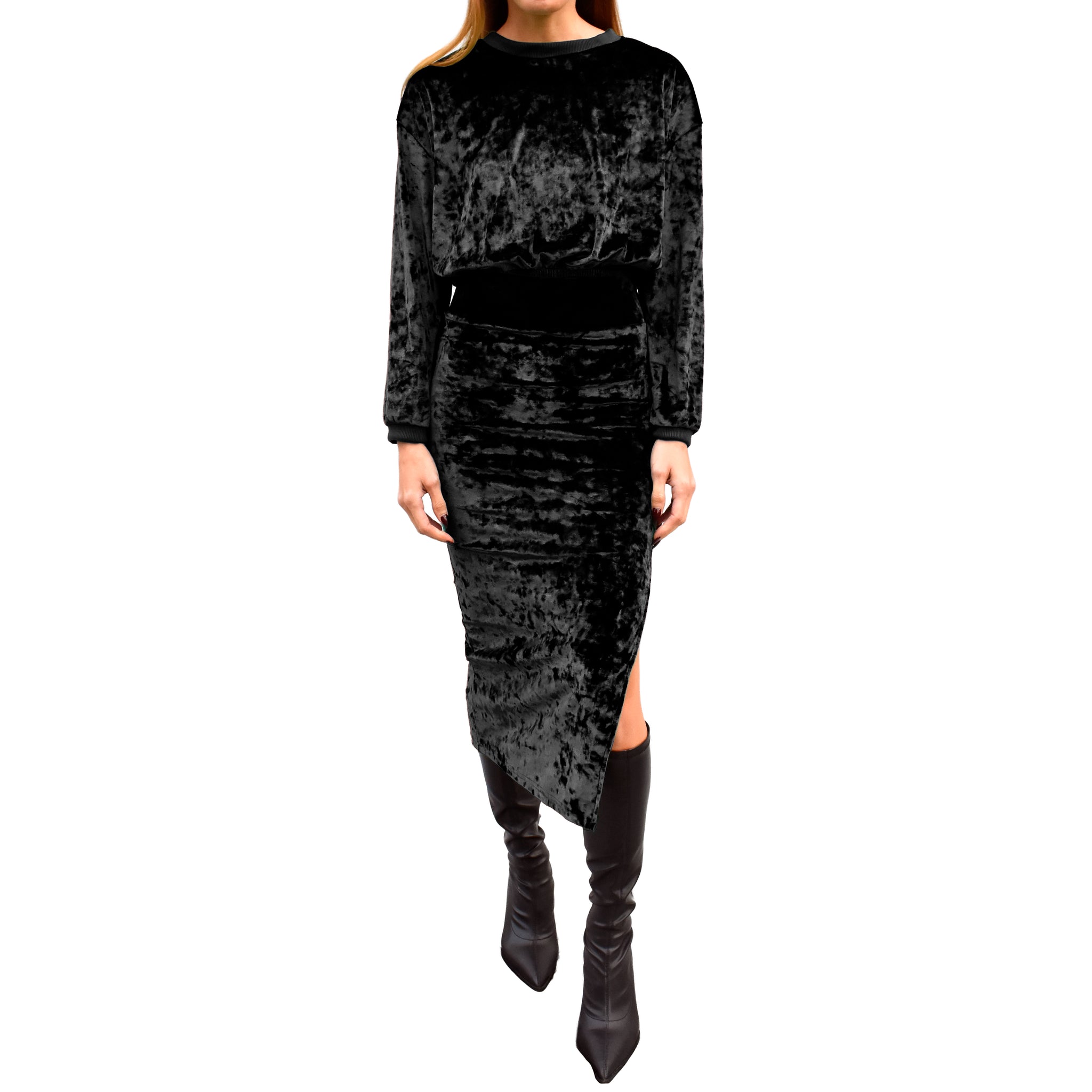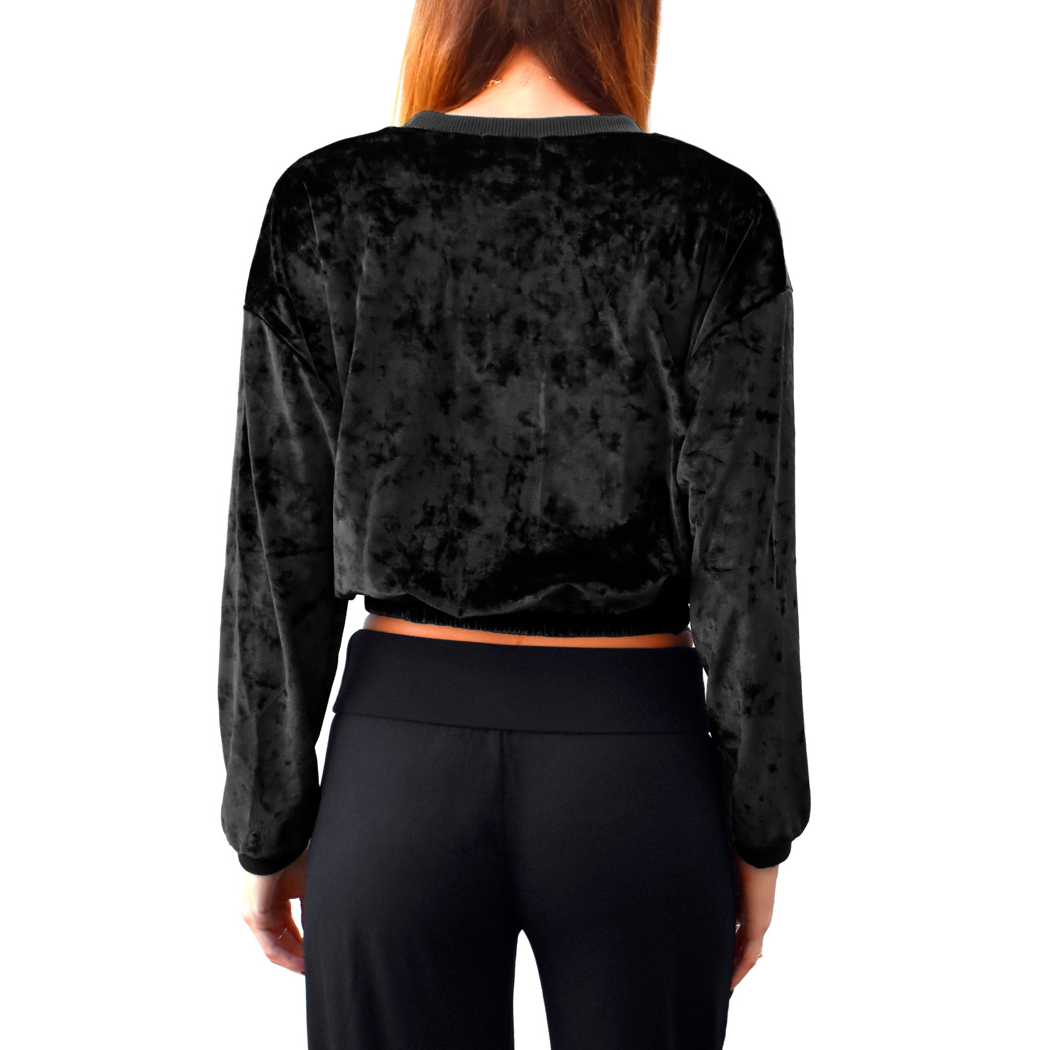 This stylish top features a crewneck neckline and long sleeves. It has a cropped short length with an elastic waist, and a flattering loose fit. It is made in high quality, lush crushed velvet stretch knit material, making it super comfortable and a great option for the holidays and cooler seasons. Available in a variety of solid jewel tone colors including black, red, dark green, olive, indigo blue and rose pink. Love a set? Browse our collection for matching bottoms.