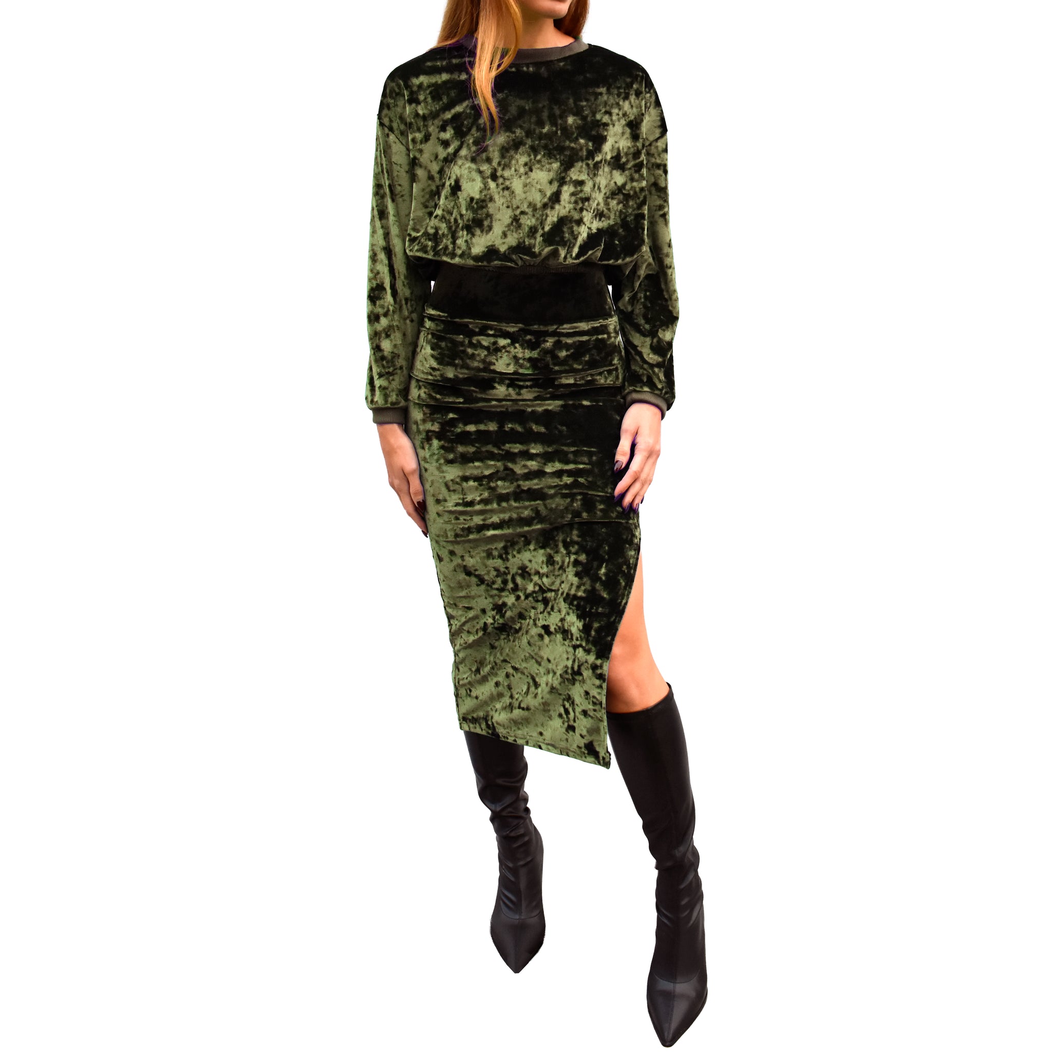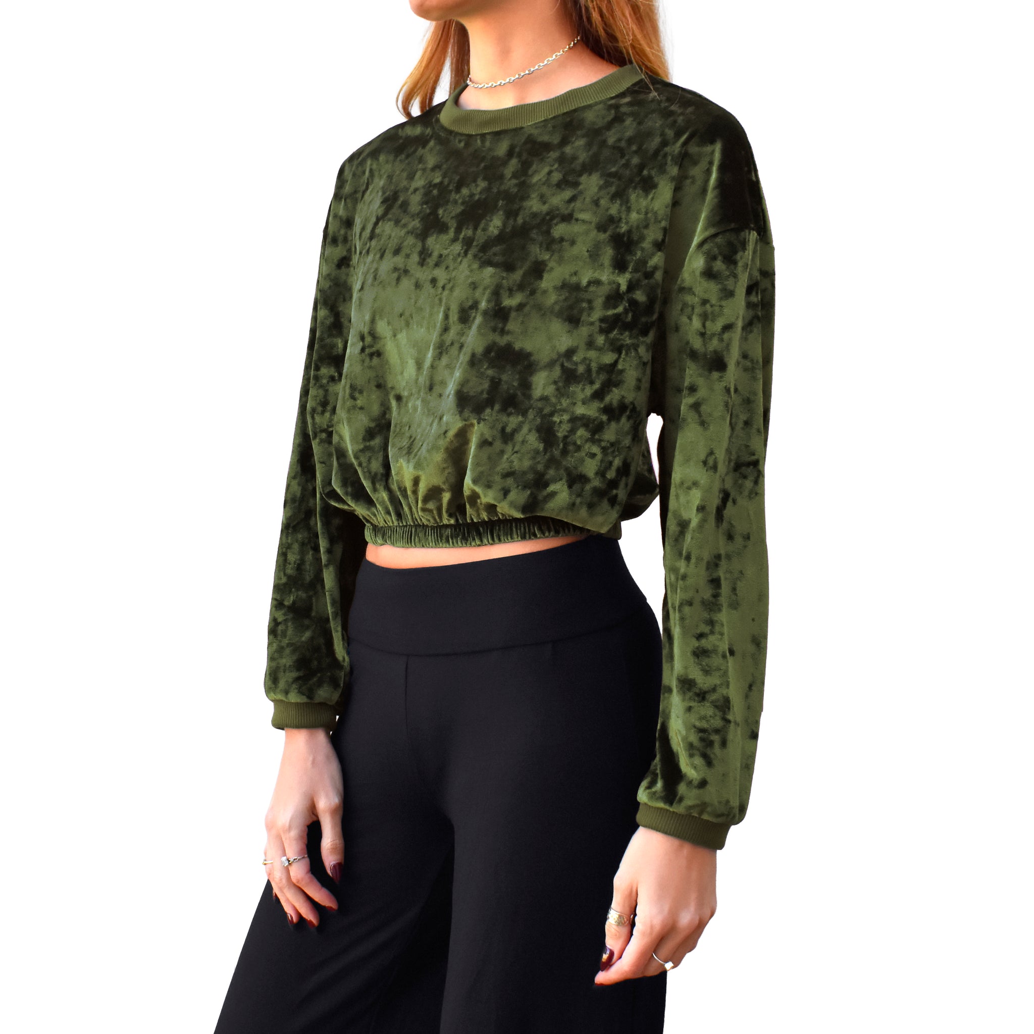 This stylish top features a crewneck neckline and long sleeves. It has a cropped short length with an elastic waist, and a flattering loose fit. It is made in high quality, lush crushed velvet stretch knit material, making it super comfortable and a great option for the holidays and cooler seasons. Available in a variety of solid jewel tone colors including black, red, dark green, olive, indigo blue and rose pink. Love a set? Browse our collection for matching bottoms.
