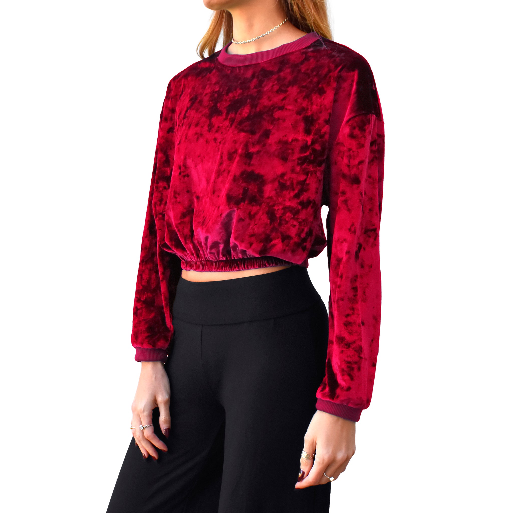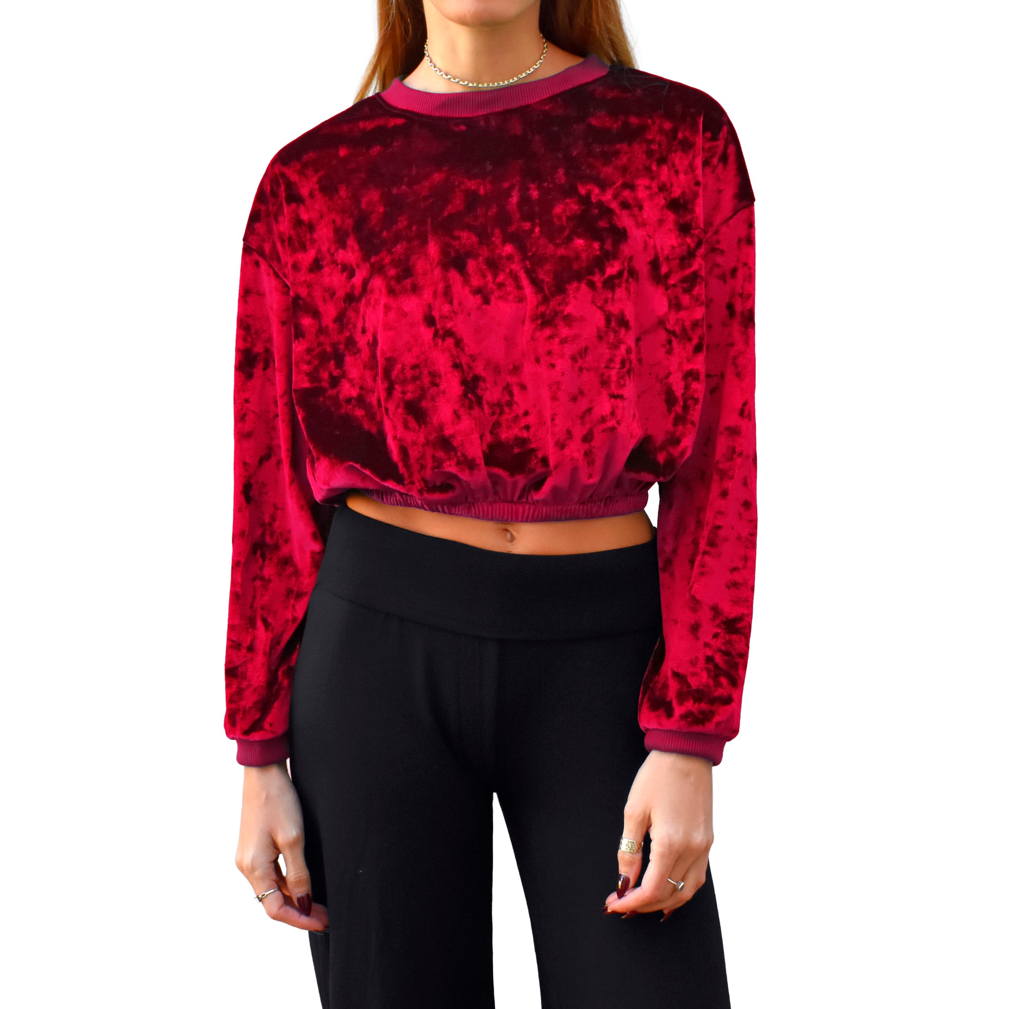 This stylish top features a crewneck neckline and long sleeves. It has a cropped short length with an elastic waist, and a flattering loose fit. It is made in high quality, lush crushed velvet stretch knit material, making it super comfortable and a great option for the holidays and cooler seasons. Available in a variety of solid jewel tone colors including black, red, dark green, olive, indigo blue and rose pink. Love a set? Browse our collection for matching bottoms.