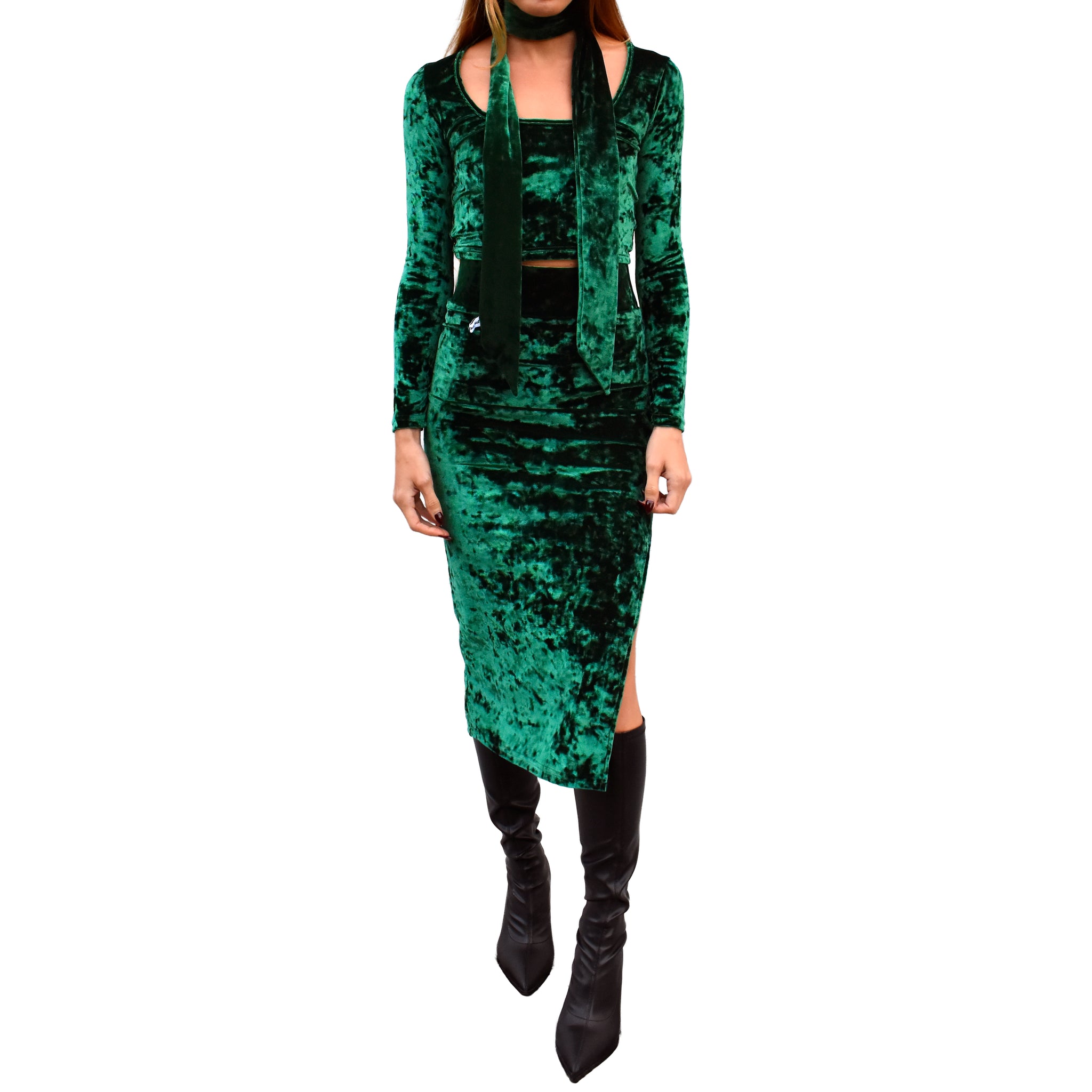 Accessorize your look with this charming skinny scarf. It is made in high-quality lush crushed velvet stretch knit material, making it super soft, comfortable and lightweight -- a great option for the holidays and cooler seasons. It's long length provides the option to wrap it once or twice around the neck, or get creative, and try it as a headband, belt, purse scarf, and more. It is available in a variety of solid jewel tone colors including black, red, emerald green, olive, indigo blue and dusty rose pink. Love a set? Browse our collection for matching tops, bottoms and more.