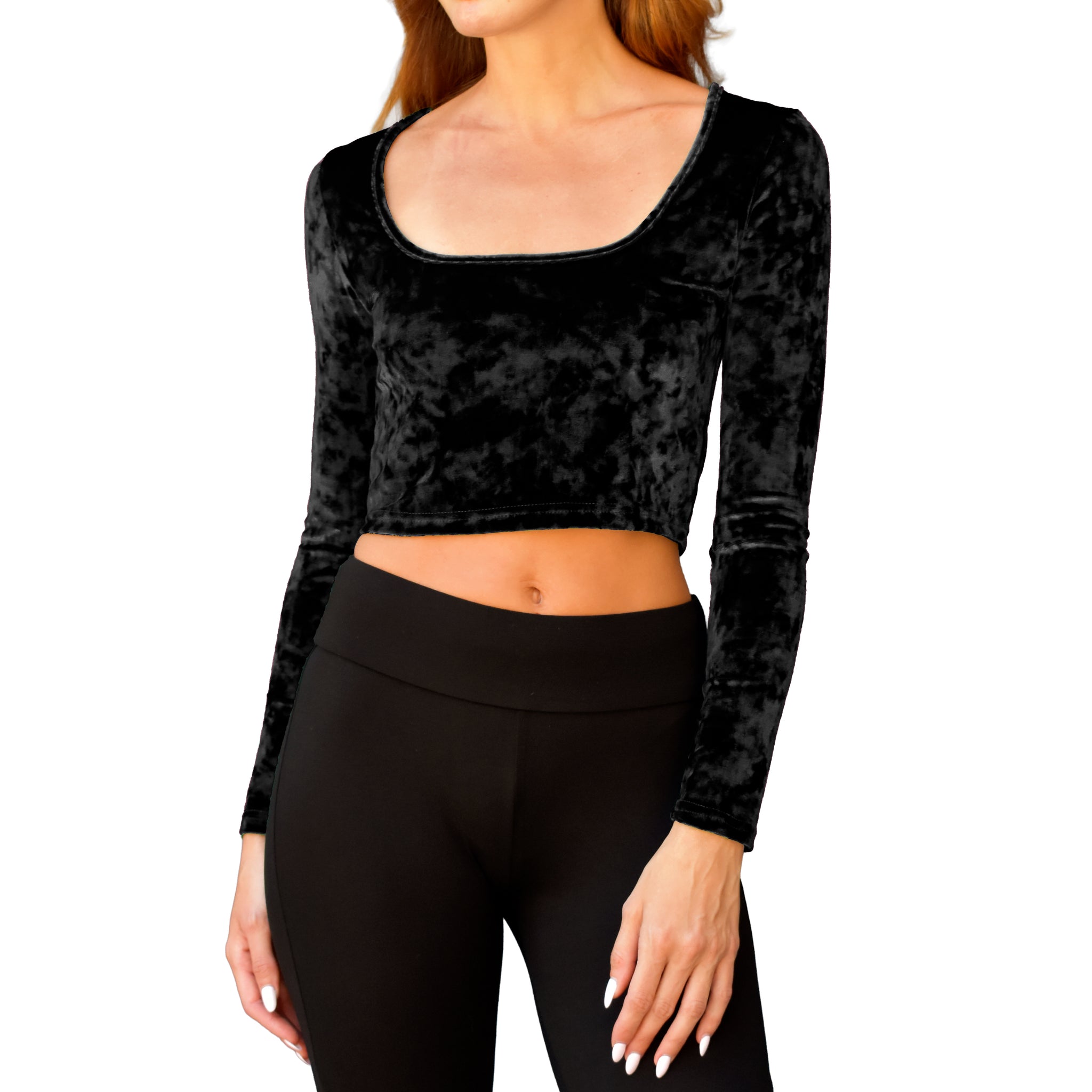 This cute top features a deep low cut square neckline, long sleeves, cropped short length and a tight fit for a sleek and flattering silhouette. It is made in high quality, lush crushed velvet stretch knit material, making it super comfortable and a great option for the holidays and cooler seasons. Available in a variety of solid jewel tone colors including black, red, dark green, olive, indigo blue and rose pink. Love a set? Browse our collection for matching bottoms.