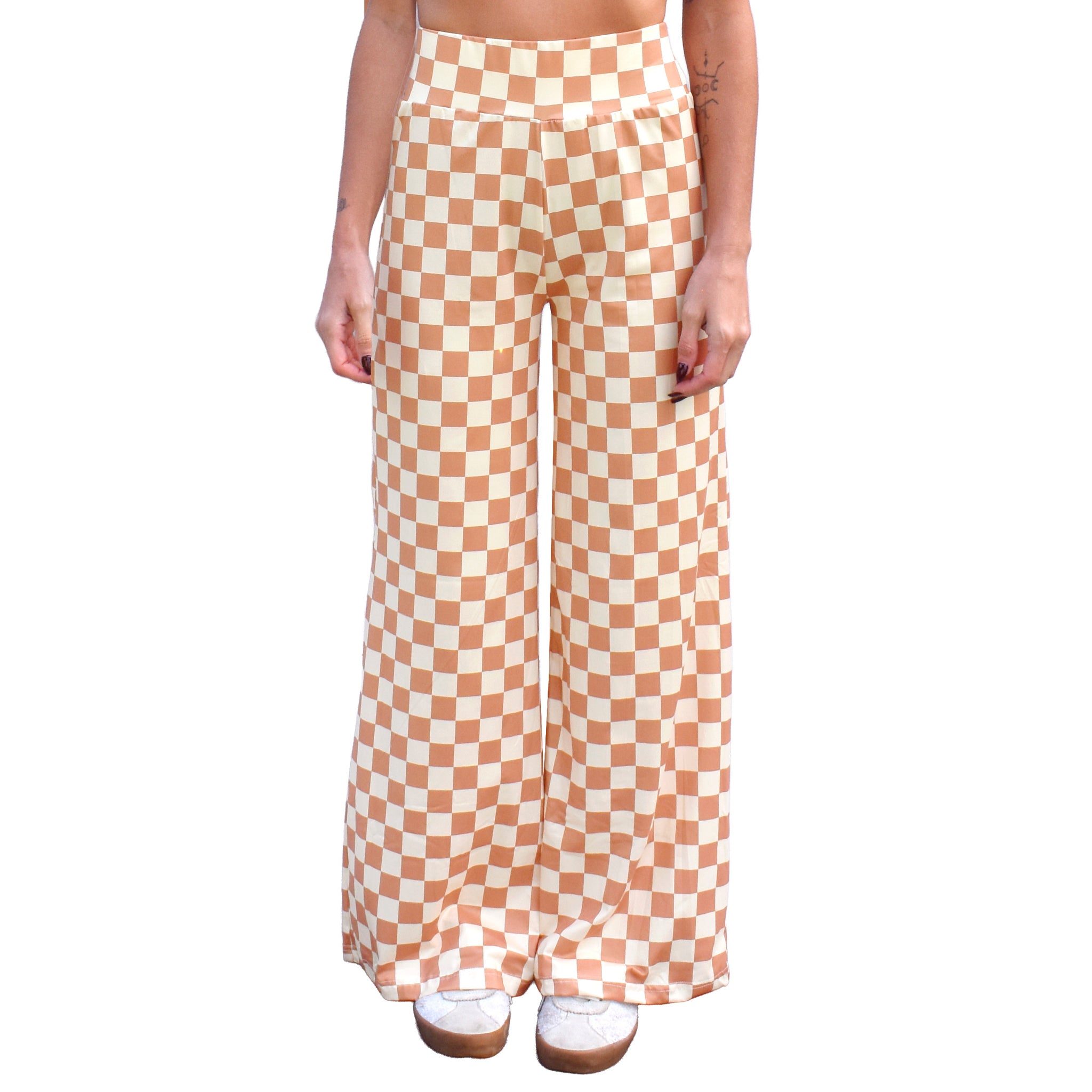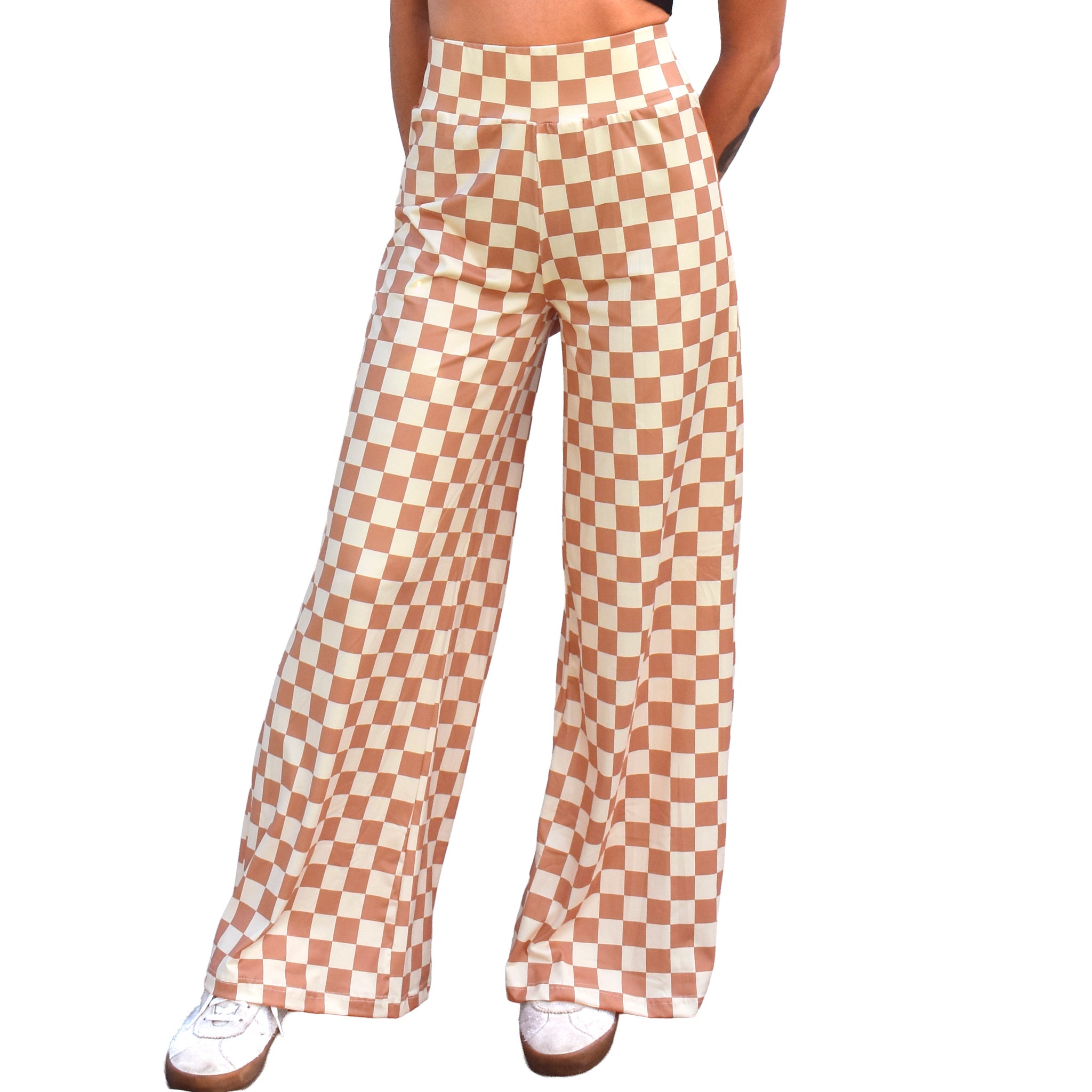These stylish lounge pants feature flowy lightweight soft stretch knit material. The wide elastic waistband provides a tummy control flattening effect and can be folded over, allowing the wearer to choose a high or mid rise waist. They are fitted around the hips and butt making them very flattering on many body types. The straight loose-fit wide leg silhouette is comfortable and on-trend. These casual comfy pants are available in a variety of boho, graphic and animal prints and solid colors including leopard, tan checkerboard, marsala pink paisley, black and white paisley, and solid black.