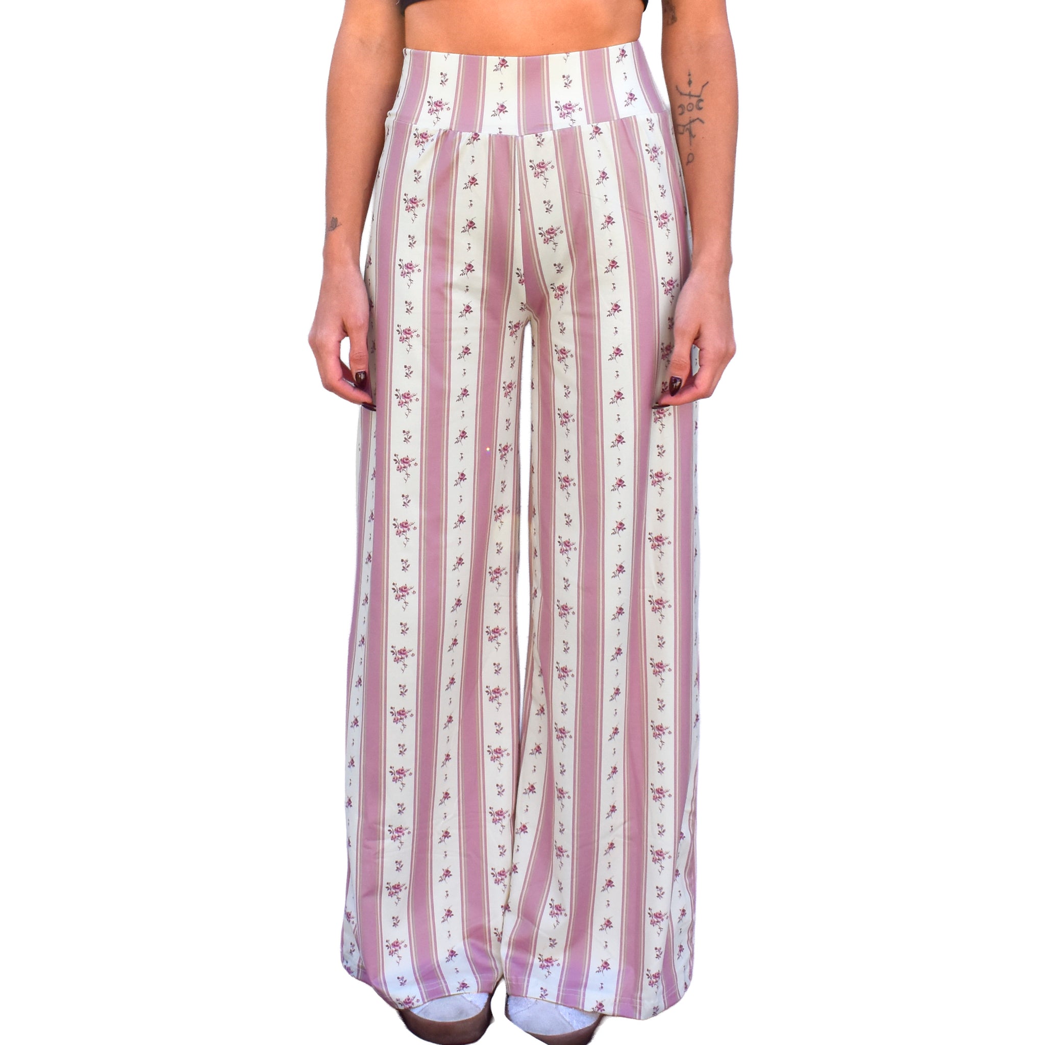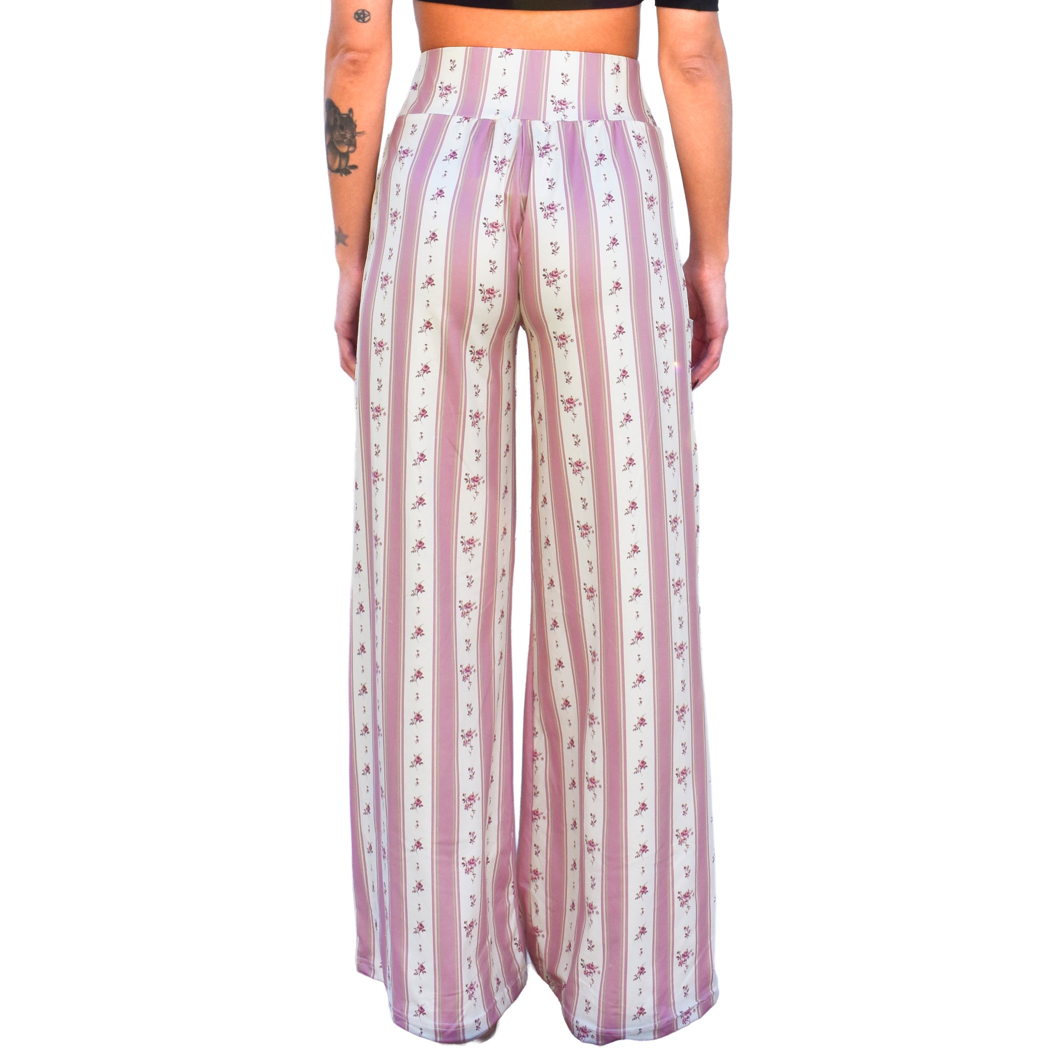 These stylish pants feature a straight loose-fit wide leg silhouette. They are tight around the hips and butt making them very flattering on many body types. The wide elastic waistband provides a tummy-control flattening effect and can be folded over, allowing the wearer to choose a high- or mid- rise waist. Wear them for casual comfy lounging or dress them up for going out. They are made in high quality, ultra soft, four-way stretch knit material, making it super comfortable and a great option for all seasons. Available in a variety of prints and solid colors including boho paisley, leopard and cow animal prints, checkerboard, coquette florals, solid black and heather grey. Love a set? Browse our collection for matching tops.