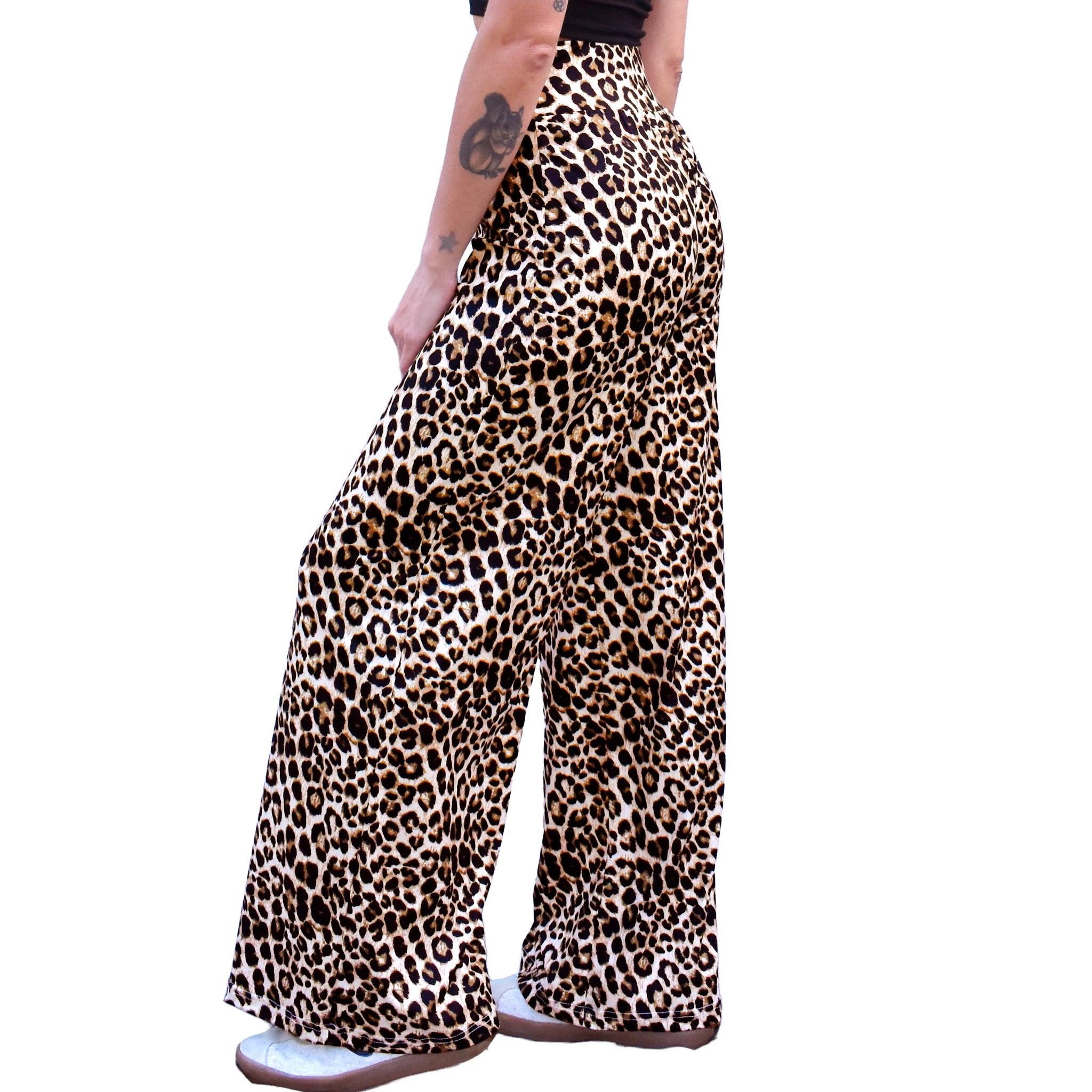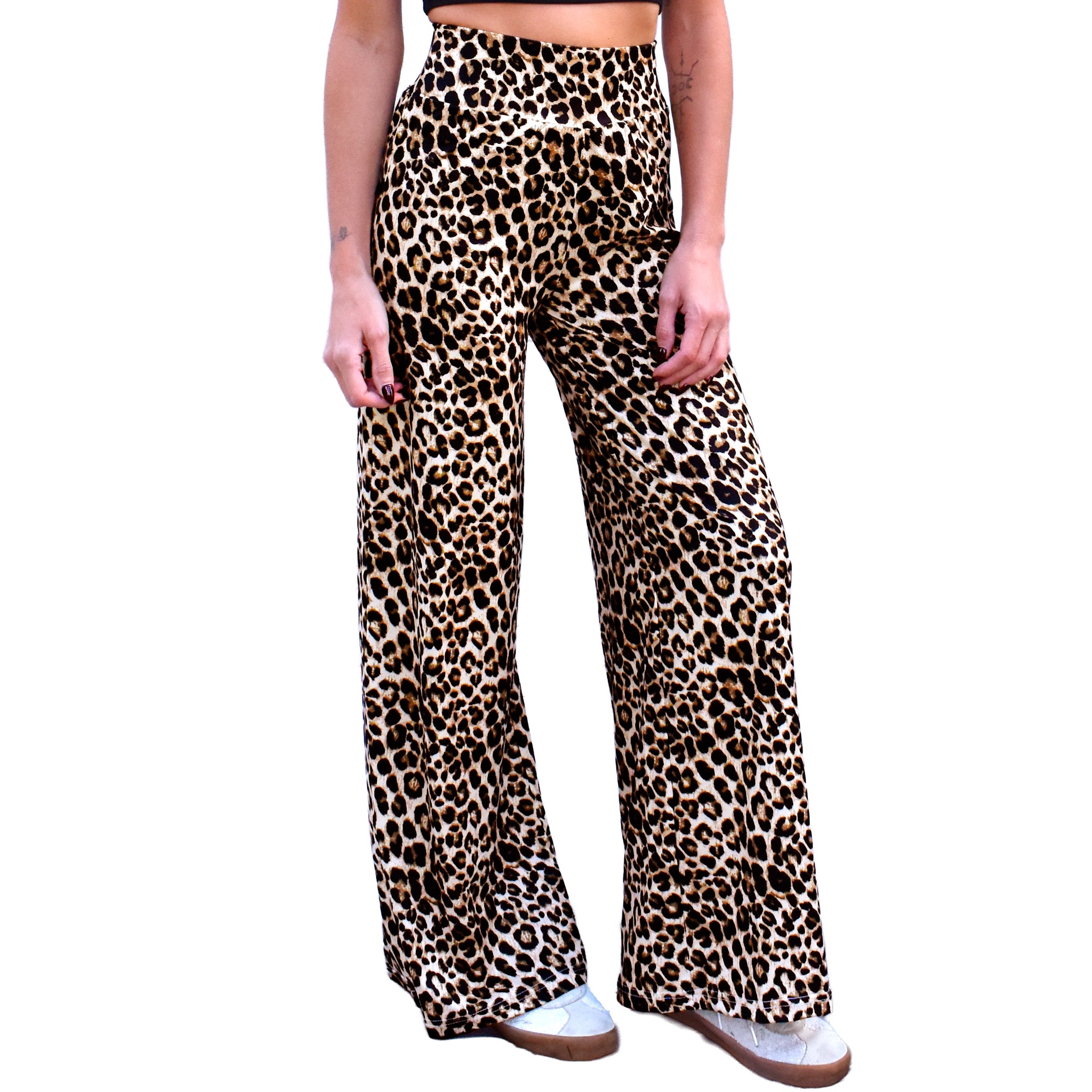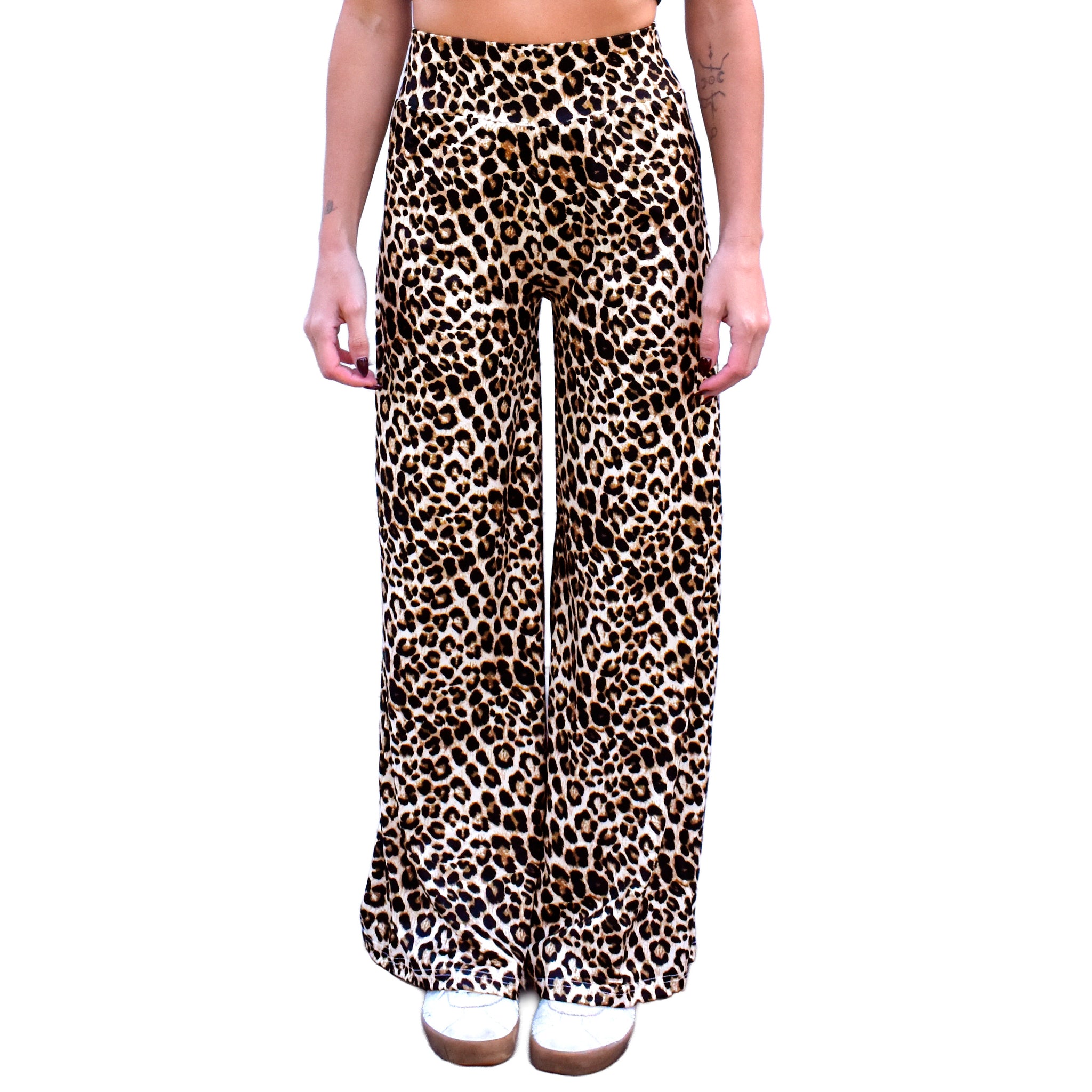 These stylish lounge pants feature flowy lightweight soft stretch knit material. The wide elastic waistband provides a tummy control flattening effect and can be folded over, allowing the wearer to choose a high or mid rise waist. They are fitted around the hips and butt making them very flattering on many body types. The straight loose-fit wide leg silhouette is comfortable and on-trend. These casual comfy pants are available in a variety of boho, graphic and animal prints and solid colors including leopard, tan checkerboard, marsala pink paisley, black and white paisley, and solid black.